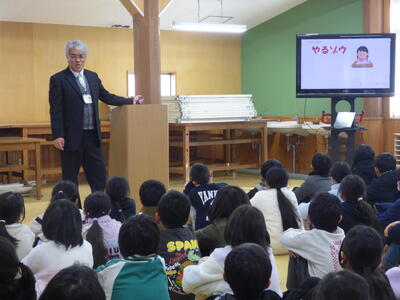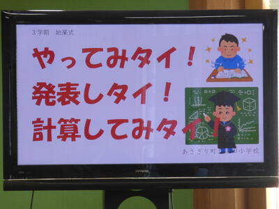 私からは、3学期には授業中に「やりなサイ」「頑張りなサイ」と言われて取り組むのではなく、「やるゾウ」「頑張るゾウ」という気持ちで学習に取り組んでほしいという話をしました。さらに「発表しタイ」「やってみタイ」「計算してみタイ」という意欲を持って取り組むと学習が楽しいものになります。そんな学習の姿を見られるように頑張ってほしいとお願いしました。