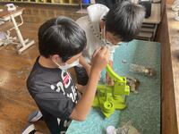 4月の授業参観で種をまいたあさがおが毎日たくさんの花を咲かせています。そのあさがおの花を使ってできる遊びの活動をしました。はじめは、あさがおの花を取ってきて、たたきぞめをしました。クリアファイルを習字紙と花をはさんで外側からハサミの持ち手でこすって開きました。きれいにあさがおの花の形が習字紙に移っていました。次に色水作りをしました。花を色別に集め袋に入れて水を少し加えて袋をよくもみます。もむと色水ができて「ワインみたい~。」と盛り上がっている子どもたちでした。最後に、色水を使って色染めをしました。色水に折りたたんだ習字紙の角につけました。それを開くと、いろいろな模様ができていました。とても楽しかったようで「おうちでもやってみたい。」といっていた子もいました。おうちでもぜひチャレンジしてほしいと思います。