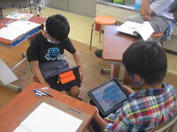 電子黒板に映し出した影絵はどんなものなのかを考えたり、並べたものをタブレットで撮影したりして、気付きを出し合いました。