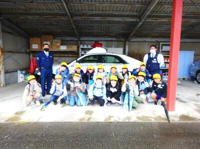 22日(月)あいにくの雨の中、社会科見学に行ってきました。消防署、警察署、ハロー免田店の3か所に行きました。消防署では、たくさんの種類の消防自動車を実際に見せてもらいながら説明を受け、初めて見る消防自動車の中の様子に大興奮の子どもたちでした。警察では、警察官の持ち物を実際に持たせてもらったりパトカーの中に乗せてもらったりしました。事前に考えた質問をすることもできていました。最後のハローでは、野菜売り場、魚売り場、肉売り場、惣菜売り場の裏側を全部見せてもらうことができました。魚を酢水につけたり、肉を切ったり、なかなか見ることのできないところを見られる貴重な体験でした。教科書で学んだことを実際に確かめたり、教科書に載っていること以外のことを発見したりできるたくさんの学びがある社会科見学でした。帰りのバスでは「消防士になりたい。」「僕は警察官になりたい。」という話も聞かれ、よい刺激になったようです。