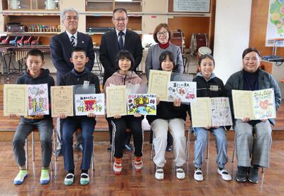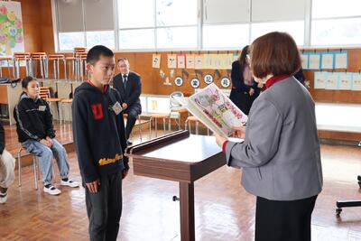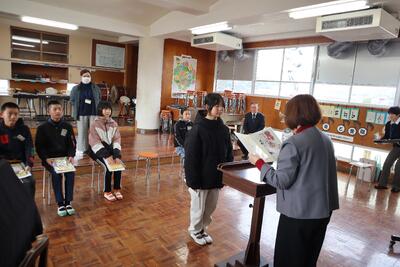 6年生が租税教室の後に取り組んだ税の絵葉書コンクールで6人の作品が入賞しましたので、人吉法人会の方と人吉税務署長様に来ていただき、表彰していただきました。