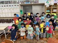 紙をすく係では、「先生、次は黄色をお願いします。」など色のリクエストが。お試しでいろいろな色を付けていたところ、色を上手にミックスさせて「これはおいものハガキ!」「これはサクラ!」など子どもたちのセンスあふれるハガキができていました。