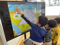 電子黒板に映し出した影絵はどんなものなのかを考えたり、並べたものをタブレットで撮影したりして、気付きを出し合いました。