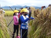 5月に行った田植えから約5か月、苗は大きく成長し大きな稲になっていました。JA青壮年部の方々の説明の後、鎌を持って一株一株手刈りをし、10束集めて紐で結び、かけ干しをしました。暑い中での作業でしたが、楽しく活動ができました。稲刈りを初めてしたという子も多く、よい経験となりました。