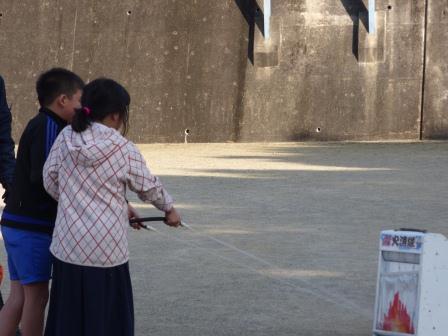 高学年の代表児童や職員が、実際に消化器を使って消火活動を行ったり、煙体験、消防車見学と、とても貴重な体験をさせていただきました!