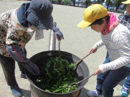 老人会・保護者の皆さまと一緒に縦割り班で茶摘みをしました。