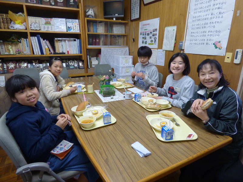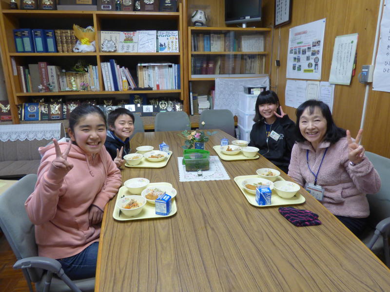 教室では給食開始から10分間もぐもぐタイムがあり、静かに給食を食べますが、校長室での給食はいつもと違う雰囲気の中、会話も弾み子どもたちもとても楽しそうです☆