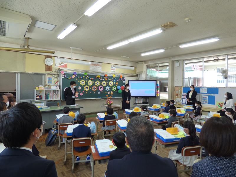 入学式の後、教室で学級活動をしました。保護者への担任の挨拶の様子です。