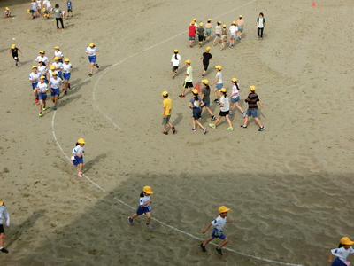 ランランタイムが始まりました。朝の活動で、児童は運動場を走ったり、サーキットトレーニングをしたりします。