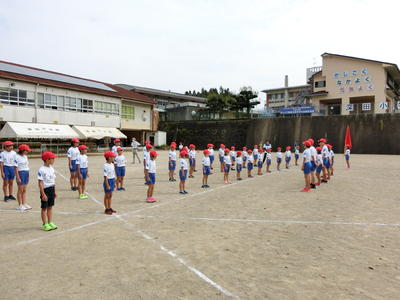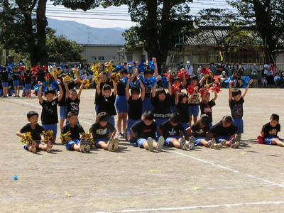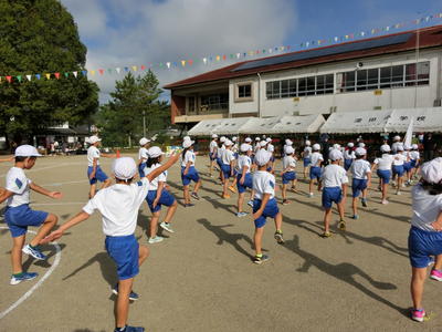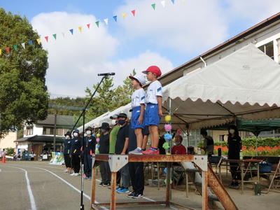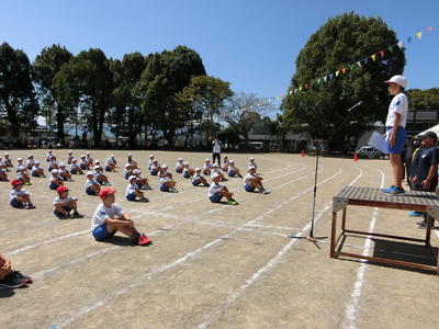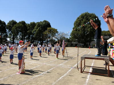 運動場に応援団リーダーの元気な声が響きました。動きをそろえてみんな頑張りました。