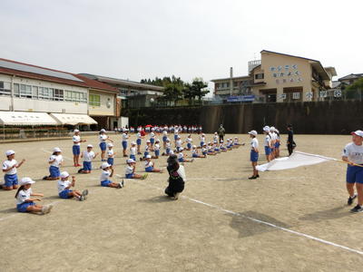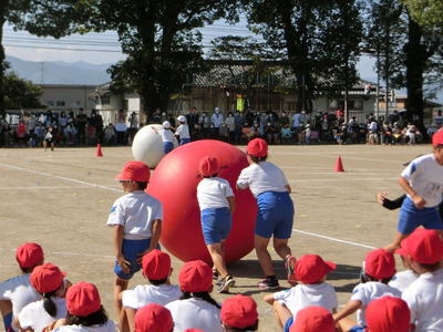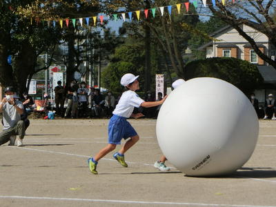 2年生3年生4年生5年生で大玉転がしをしました。二人組でリレーをします。
