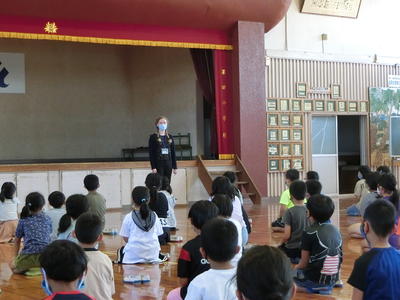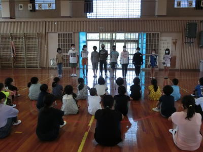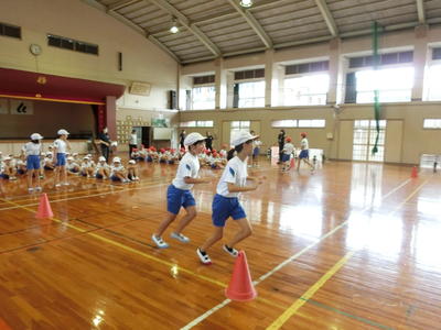 9月17日(木)雨天のため、体育館で団体競技の練習をしました。大玉ころがしです。二人組で大玉をころがしてリレーしていきます。