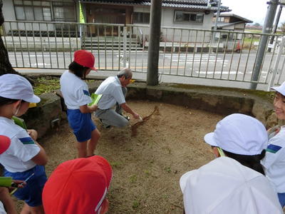 9月26日(土)5年生の理科 流れる水のはたらき の学習です。校庭の南がわの運動場の砂山を掘って川を作り、水を流して、様子を観察しました。