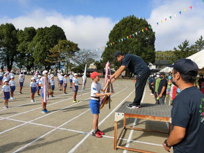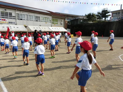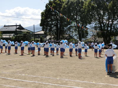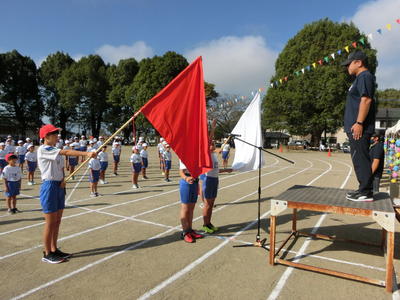 「運動会の歌」を歌いました。8月から練習をしてきたので、赤白のタイミングもバッチリです。
