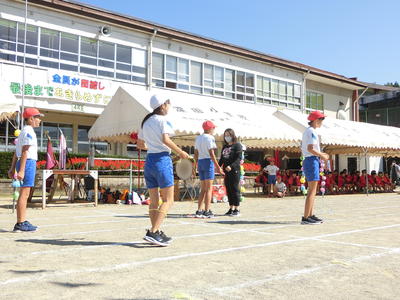 6年生の親子競技の様子です。親子で一緒に縄跳びをとび、風船をわり、おんぶや二人三脚でゴールしました。