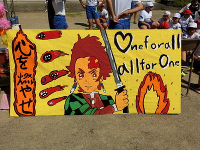 赤組の応援ポスターです。実行委員会の児童が描きました。