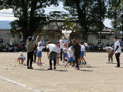 1年生の赤白対抗親子玉入れの様子です。1回戦は児童どうしの対決でした。