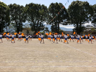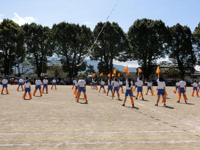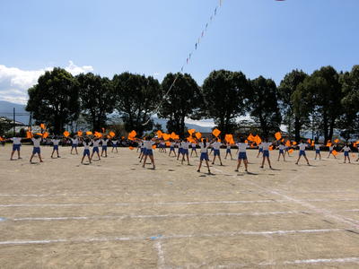 4年生5年生6年生の表現種目 「ライジングサン」の様子です。旗を使ったマスゲームです。