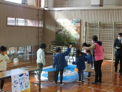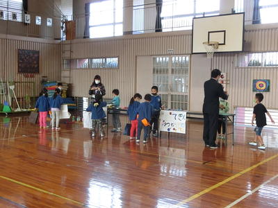 11月26日(木)1・2年生で、「あきまつり」を開きました。手作りの商品を並べて売りました。お客さんは、まこと保育園の皆さんです。くじびきやさんや、さかなつりやさん、おもちゃやさんと、楽しい商品や催しで体育館がにぎわいました。