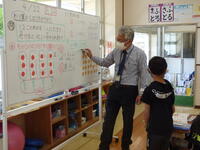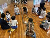 音楽では、「BINGO」や「ロンドン橋がおちる」など体を使った遊び歌をやりました。コロナ禍の中、まだ大きい声では歌えない状況ですが、すぐに歌を覚えて楽しそうに体を動かしていました。