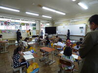 2年生と一緒に学校探検に行きました。職員室に入ったり、初めて校長室に入ったり、理科室、図工室、パソコン室などたくさんのを探検しました。また、入る時は「1年生の~です。~をしにきました。入ってもいいですか。」と言って入り、出る時は中の先生方におへそをむけて「失礼しました。」という出入りの仕方も2年生に教えてもらいながら、練習しました。音楽室の中でたくさんの楽器を見たり、家庭科室の水道はどこにあるかを探したりして、たくさんの発見がありました。