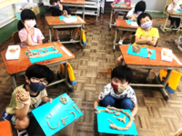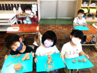 図工の「ねんどとなかよし」の学習をしました。最初に、粘土をちぎったり、こねたりした後、お団子やひも状のものをつくったり、好きなものをたくさんつくったりして、楽しそうに活動していました。ワニ、お家、たまご、ハート、お皿などたくさんのものができました。お片付けの仕方もきちんと練習して、粘土となかよくなれた1年生です。
