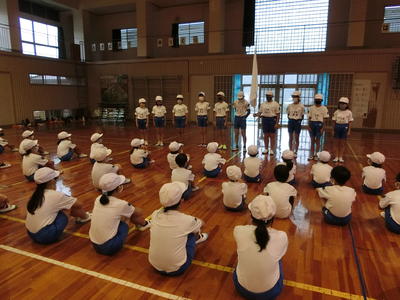 9月1日(火)体育委員会の発表がありました。「気をつけ」「休め」の姿勢についてなど、運動会に向けて呼びかける内容でした。