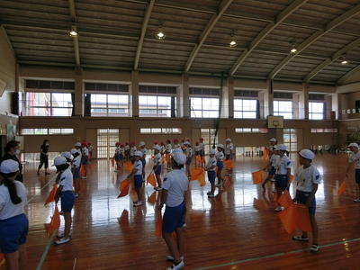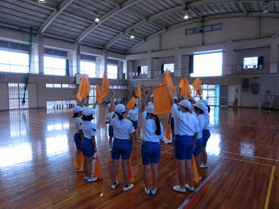 今年の高学年の表現運動は、旗を使ったマスゲームを行います。全員の動きを合わせて旗をふります。