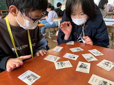 外国語活動の「This is my day.」では、物語の内容を確かめたり、一日の様子を言う練習をしたりしました。かるたやチーム戦のゲームをして言い方に慣れることができました。また、目が覚める時間を友達に伝えることもできました。