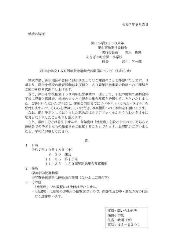 10月18日(土)に150周年記念運動会を開催します。運動会終了後に児童や保護者、地域の方々での集合写真を撮影しようと考えています。ご都合がよろしければ、ぜひ150周年記念に集合写真に写られてください。また、お時間に余裕が有られる方は、運動場西側に狭いですが「地域席」を設けますので、そちらで運動会での子どもたちの頑張りをご観覧いただければ幸いです。