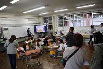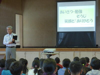 まず最初に、1年生の代表の子ども2人が2学期の思い出と3学期に頑張りたいことを発表しました。南稜高校に動物とのふれ合いに行ったことなど楽しかった思い出を伝えてくれました。