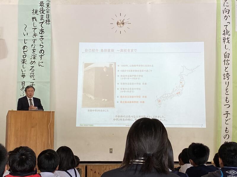 10月24日(火)は里帰り講演会でした。東京から島田社長にお越しいただき、「夢」についてご講話いただきました。熊本出身の社長さんのお話に、子供たちは目をキラキラと輝かせていました。講話を聴いた子供たちは、「夢は大きくもっていいことが改めて分かりました」「20年後を考え、苦手なことにも挑戦していきたいです」など、様々な感想をもっていました。