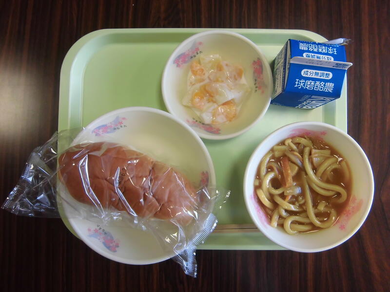 メニュー:米粉パン、野菜コロッケ、カレーうどん、フルーツのゼリー、牛乳
