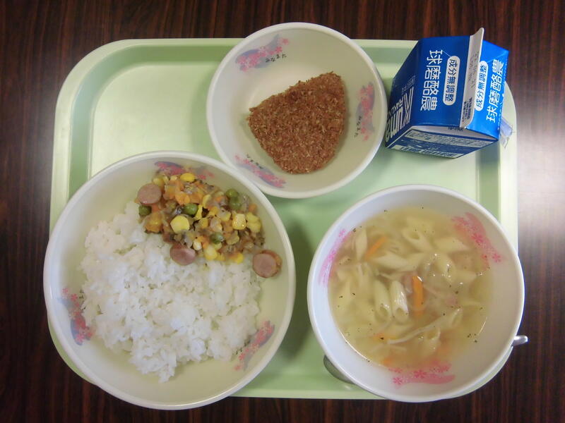 メニュー:ピラフ(ごはん、ピラフの素)、ペンネのスープ、かぼちゃフライ、牛乳