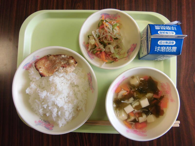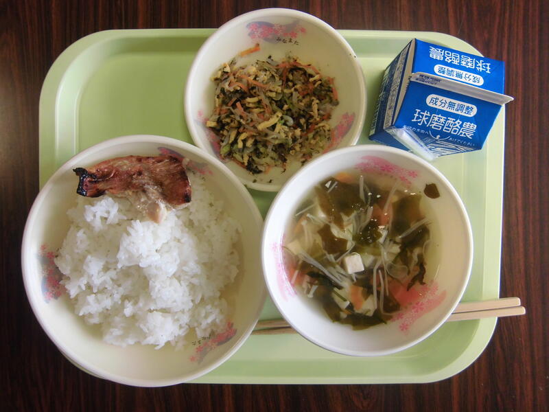 メニュー:ごはん、魚の西京焼き、すまし汁、かつのり和え、牛乳