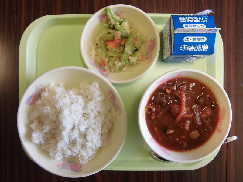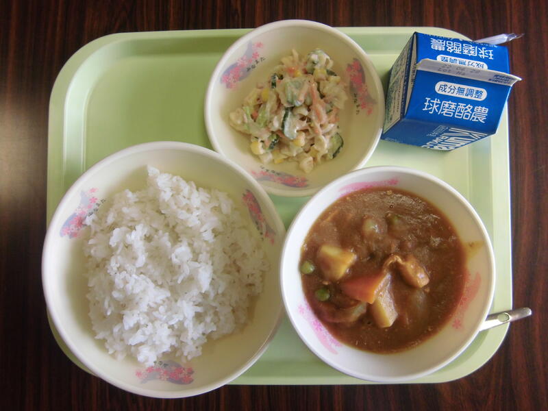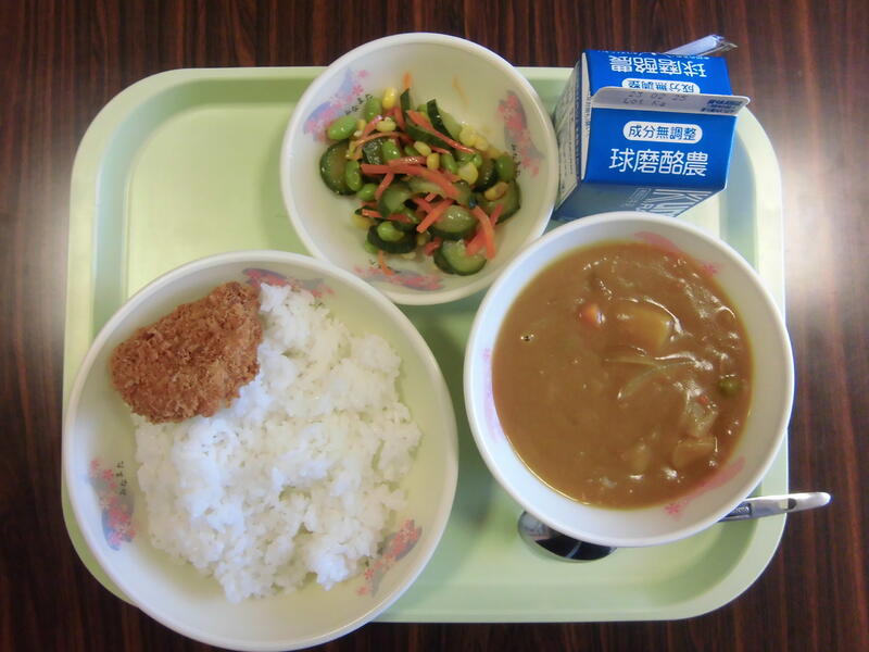 子供たちに大人気のカツカレーでした。1時間目に教室へ行くと、ある子供が「今日の給食はカツカレーですよ」と教えてくれました。楽しみにしているんだなぁと思いました。子供たちは、ごはんにカレーをかけたり、カレーの中にごはんを入れたり、好みに応じて、おいしそうに食べていました。
