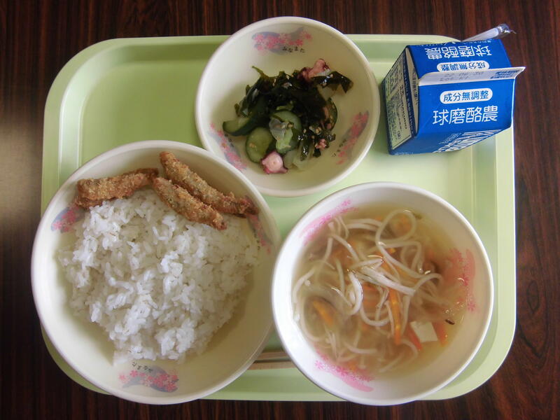 メニュー:麦ごはん、小いわしフライ、あおさ汁、たこときゅうりの酢の物、牛乳