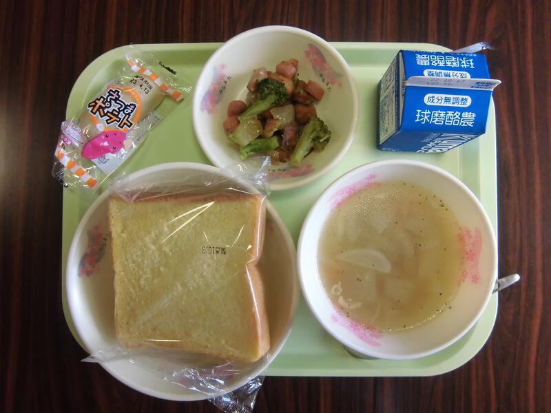 メニュー:ドッグパン、ウインナー、一食ケチャップ、オニオンスープ、粒マスタードサラダ、牛乳