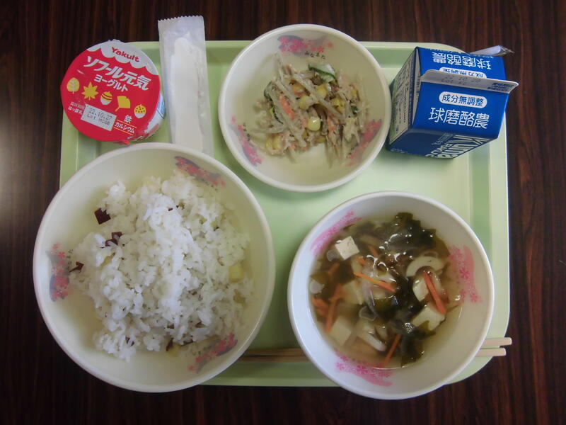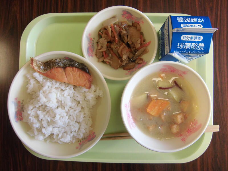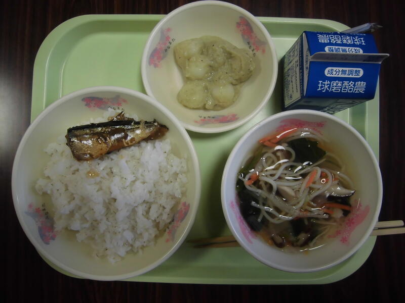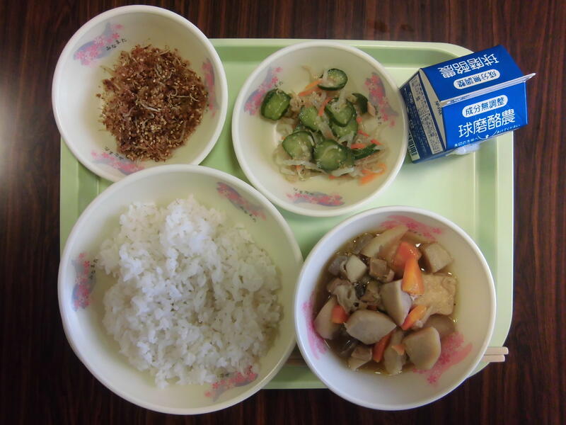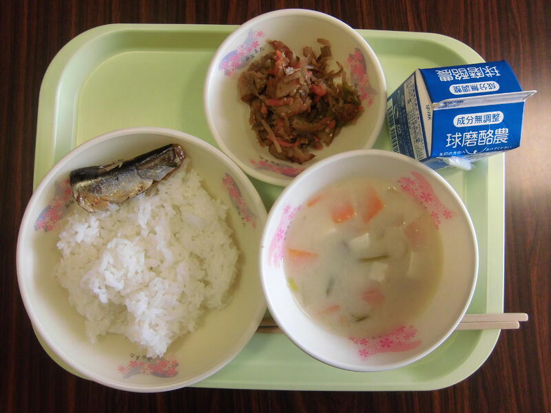 メニュー:ごはん、いわし梅煮、豆乳みそ汁、五目きんぴら、牛乳