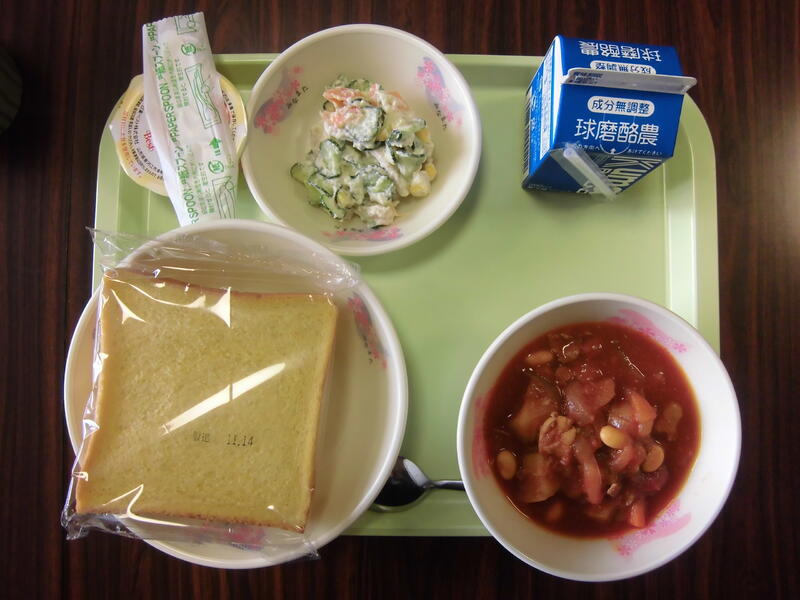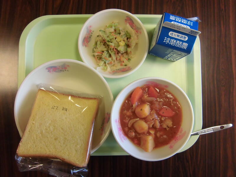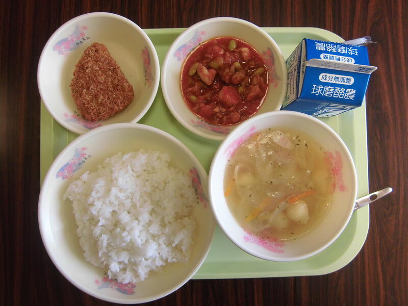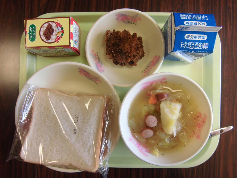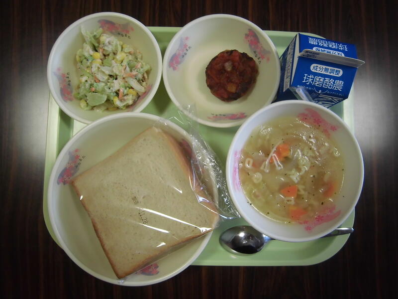 メニュー:ドッグパン、チリコンカン、ベーコンと野菜のスープ、みなまたサラダ、牛乳