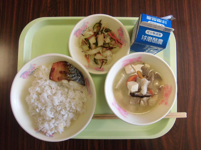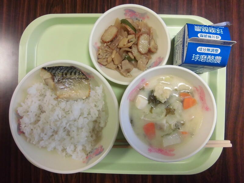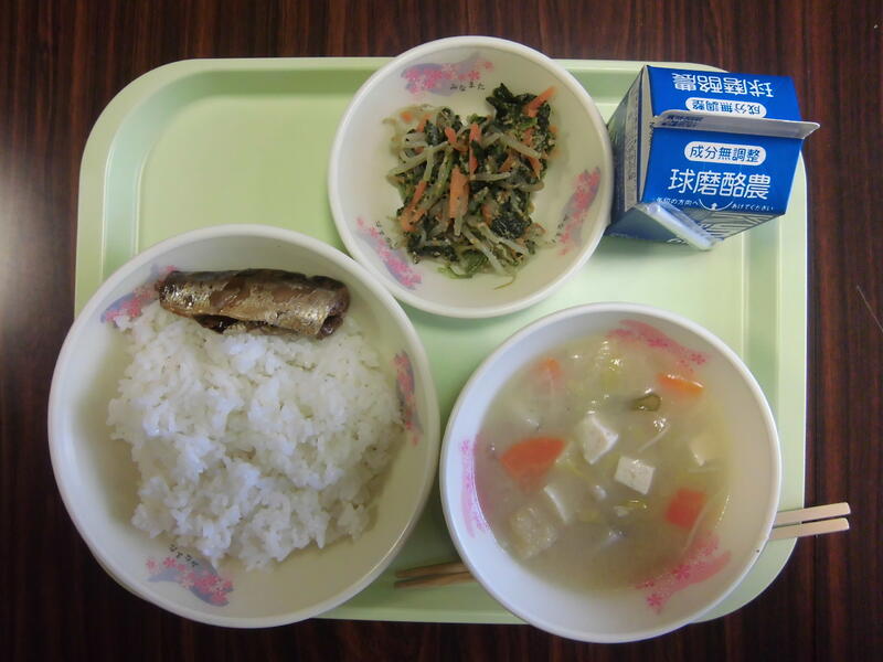 メニュー:ごはん、いわしの生姜煮、豆乳みそ汁、野菜の梅和え、牛乳