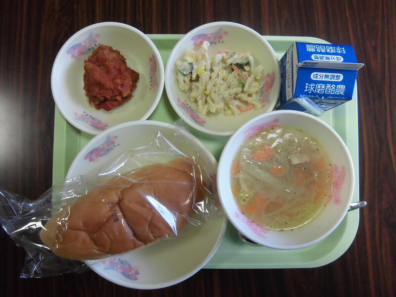 メニュー:米粉入り人参パン、春雨タンタン麺、フルーツポンチ、牛乳