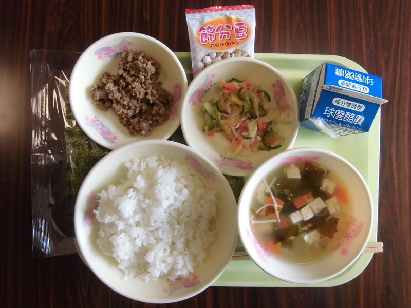 メニュー:セルフ手巻き(ごはん、肉みそ、のり)、すまし汁、梅おかか和え、節分豆、牛乳