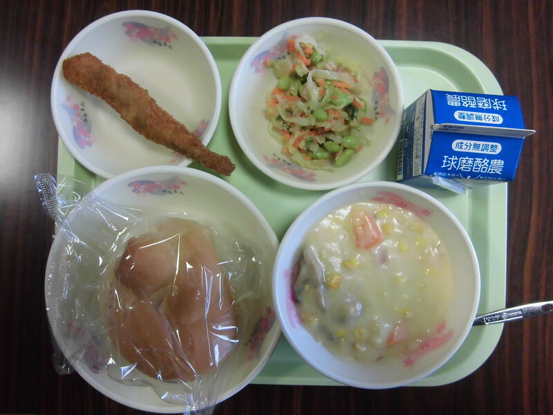 メニュー:ひのくにパン、子持ちししゃも、コーンクリームシチュー、菜の花サラダ、牛乳