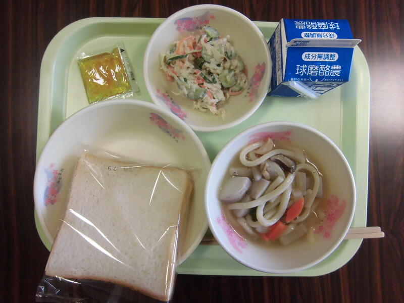 メニュー:食パン、みかんジャム、しっぽくうどん、切干大根のサラダ、牛乳
