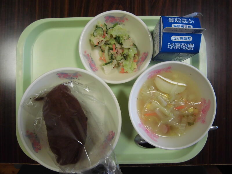 メニュー:ココア揚げパン、野菜たっぷりスープ、ツナサラダ、牛乳