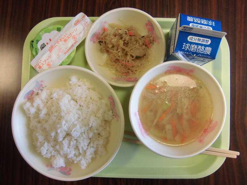メニュー:麦ごはん、肉団子の中華スープ、チャプチェ、牛乳、セレクトデザート(お茶プリン又はぶどうゼリー)