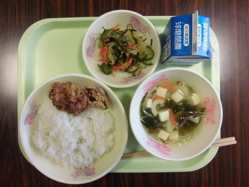 メニュー:ごはん、鶏のから揚げ、わかめスープ、しそ昆布和え、牛乳