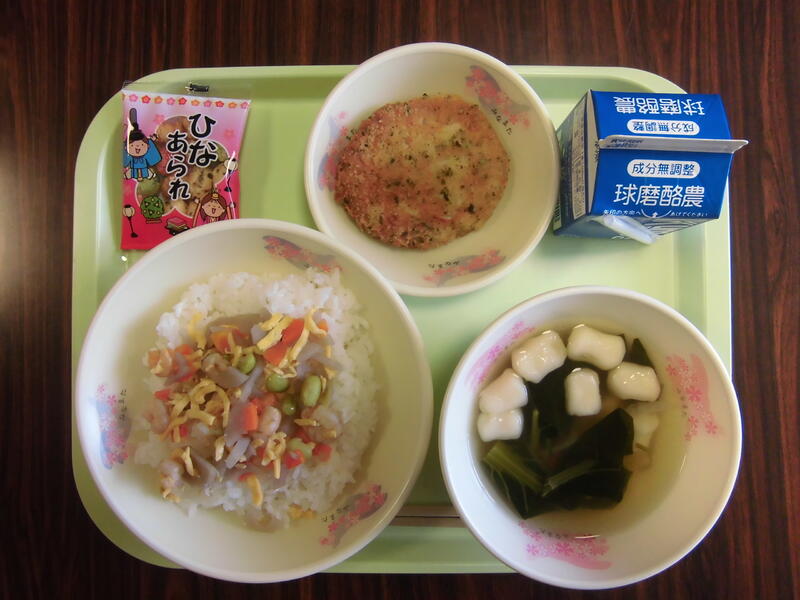 メニュー:ちらし寿司(ごはん、ちらし寿司の具)、はんぺん汁、大豆と豆腐のフライ、牛乳