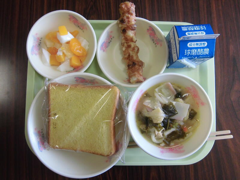 メニュー:人参パン、五目うどん、ちくわの天ぷら、フルーツ杏仁豆腐